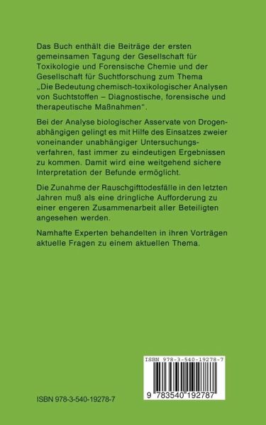 Begrüßung und Einführung (1).- Begrüßung und Einführung (2).- Suchtstoffanalysen: Probleme der Probengewinnung und Auswertung im forensischen, diagnostischen und therapeutischen Bereich.- Spektrum gebräuchlicher Suchtstoffe.- Cannabiskonsum - Nachweisbarkeitsdauer, zeitlicher Verlauf, forensische Bedeutung.- Analytik der Suchtstoffe unter forensischen Gesichtspunkten.- Differentialdiagnostik des Opiatnachweises.- Differenzierter Nachweis eines Heroinkonsums durch Analyse der Morphiate im Urin.- Der Drogentod in Hamburg - Bilanz und Nachweis.- Mißbrauch von Dopingmitteln und Diuretika.- Kontrolle der Opiateinnahme - Wie können bei Urinkontrolluntersuchungen falsche Interpretationen ausgeschlossen werden?.- Welche Aussagekraft besitzen Immunoassays zur Kontrolle der Cannabiseinnahme.- Urinkontrollanalysen in der Therapie von Drogenabhängigen.- Die Exposition der Bevölkerung mit suchtstoffhaltigen Arzneimitteln.- "Schnüffelstoffe".- Begleitstoffanalytik bei Alkoholabusus.- Laxantienabusus.- Analgetikanephropathie - Klinische und epidemiologische Aspekte.- Zur Rolle des dopaminergen Systems bei der akuten und chronischen Wirkung von Opioiden.- Einstellung gegenüber erneuter Benzodiazepinexposition nach Behandlung wegen chronischen Mißbrauchs.- Klinische Charakteristika von Patienten mit positivem Nachweis von Benzodiazepinen im Urin.- Pharmakologisch aktive Benzodiazepine pflanzlicher Herkunft im Hirn und Blut von Mensch und Säugetier als wahrscheinliche physiologische Liganden zentraler Benzodiazepinrezeptoren.- Erkennung der Medikamentenabhängigkeit mit Hilfe von Suchtstoffanalysen.- Medikamenteneinnahme von Abhängigkeitskranken vor Aufnahme in eine psychiatrische Großklinik - ermittelt durch ärztliche Befragung und Urinanalyse.- ZumNachweis von Buprenorphin in Leichenteilen nach 11monatiger Inhumationszeit.- Konditionierung und Drogenabhängigkeit.- Qualitative und quantitative Bestimmung von Barbituraten und Benzodiazepinen aus Serum mittels HPLC.- Alkoholismusdiagnose mit Hilfe von Standardlaborwerten?.- Charakterisierung des Benzodiazepinentzuges bei "High-dose"- und "Low-dose"-Benzodiazepinabhängigkeit.- Änderungen der Sprechmotorik unter niedrigen Blutalkoholspiegeln.- Ein Fall von Cannabisingestion bei einem 16monatigen Mädchen.- Erkrankungsverlauf und Mortalität bei Suchtkranken: vorläufige Katamneseergebnisse.- Erste Ergebnisse einer epidemiologischen Cannabinoiduntersuchung mit EMIT-dim, kombiniert mit einer Bestätigungsanalyse.- Diskrepante Befunde zwischen EMIT-st (Benzodiazepine) und DC-Screening.