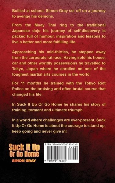 A true story about the courage to stand up, keep going and never give in! Bullied at school, Simon Gray set off on a journey to avenge his demons. From the Muay Thai ring to the traditional Japanese dojo his journey of self-discovery is packed full of humour, inspiration and lessons to live a better and more fulfilling life. Approaching his mid-thirties, he stepped away from the corporate rat race. Having sold his house, car and other worldly possessions he travelled to Tokyo, Japan where he enrolled on one of the toughest martial arts courses in the world. For 11 months he trained with the Tokyo Riot Police on the bruising and often brutal course that changed his life. In Suck It Up Or Go Home he shares his story of training, torment and ultimate triumph. In a world where challenges are ever-present, Suck It Up Or Go Home is about the courage to stand up, keep going and never give in! This book is about stepping out of your comfort zone to embrace new opportunities and challenges. While a book with martial arts at its core, it's much more than a book on martial arts. It's a true story of resilience, discipline and succeeding against the odds. It charts the author's life from a tough boarding school to the present day. It's a tale of self-discovery, self-awareness and is packed full of humour alongside serious observations on life. It details what happened on the Yoshinkan Aikido 16th international Senshusei course in Tokyo Japan, and brings to life the craziness of everyday life on one of the toughest martial arts courses in the world.If you have an interest in the martial arts, Japanese culture, or what it takes to keep going during difficult times, you'll definitely enjoy this book.