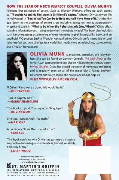 Suck It, Wonder Woman! brings Olivia Munn's unique humor, incredible wit, and lightning-fast costume changes to a world that needs more scrapbooking, sea monkeys, and for the love of God, a freakin' hoverboard! In this hilarious collection you'll find essays like "Thoughts About My First Agent's Girlfriend's Vagina," wherein Olivia skewers what it's like to live in Hollywood. In "Sex: What You Can Do to Help Yourself Have More of It," she frankly gets down to the business of getting it on, including advice on how to appropriately wrap it and bag it. In "What to Do When the Robots Invade (Yes, When!)," Olivia offers valuable information on . . . what to do when the robots invade! And just when you thought she couldn't get any more geeky, she can. This book also includes such handy treasures as a timeline of great moments in Geek history, a flip book, an unofficial FAQ section, and a nifty (read: smokin') foldout poster.