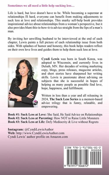 Cyndi Lewis was born in South Korea, was adopted to Wisconsin, and currently lives in Duluth, MN. Her decades of writing marketing copy, blogs, press releases, magazine articles, and short stories have sharpened her writing skills. Lewis is passionate about advising on subjects that she is successful in hopes of helping as many people as possible to find love, hope, happiness, and fulfillment.Written in less than a year and all releasing in 2024, The Suck Less Series is a memoir-based advice trilogy that is funny, relatable, and empowering.Book #1: Suck Less at Love: She Said, He Said Advice on RelationshipsBook #2: Suck Less at Parenting: How NOT to Raise Little MonstersBook #3: Suck Less at Life: Defy Mediocrity & Live without RegretsFollow Lewis' author profile and Instagram (@CyndiLewisAuthor) for updates on her new releases.