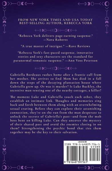 Gabriella Bordeaux rushes home after a frantic call from her mother. She arrives to find Mom has died in a fall down the steps of the decaying plantation house where Gabriella grew up. Or was it murder? Is Luke Buckley, the secretive man renting one of the nearby cottages, a killer? The moment Luke and Gabriella touch each other, they establish an intimate link. Thoughts and memories zing back and forth between them along with an overwhelming sexual craving. Before they can explore their astonishing connection, they're on the run from the man desperate to unlock the secrets of Gabriella's past--and from the mob boss bent on killing Luke. Can they uncover the mystery of their shared past and avoid the enemies closing in on them? Strengthening the psychic bond that ties them together may be the key to their salvation.