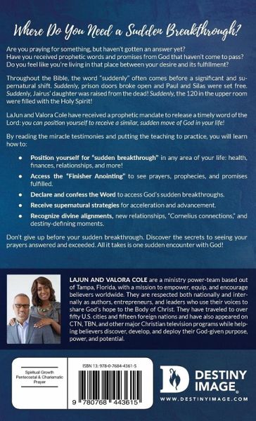 Sudden Breakthrough: Decrees, Prayers, and Confessions to Access Your Suddenly Moment LaJun and Valora Cole Where do you need a sudden breakthrough? Are you praying for something, but haven’t gotten an answer yet? Have you received prophetic words and promises from God that haven’t come to pass? Do you feel like you’re living in that place between your desire and its fulfillment? Throughout the Bible, the word "suddenly" often comes before a significant and supernatural shift. Suddenly, prison doors broke open and Paul and Silas were set free. Suddenly, Jairus’ daughter was raised from the dead! Suddenly, the 120 in the upper room were filled with the Holy Spirit! LaJun and Valora Cole have received a prophetic mandate to release a timely word of the Lord: you can position yourself to receive a similar, sudden move of God in your life! By reading the miracle testimonies and putting the teaching to practice, you will learn how to: Position yourself for "sudden breakthrough" in any area of your life: health, finances, relationships, and more! Access the "Finisher Anointing" to see prayers, prophecies, and promises fulfilled. Declare and confess the Word to access God’s sudden breakthroughs. Receive supernatural strategies for acceleration and advancement. Recognize divine alignments, new relationships, "Cornelius connections," and destiny-defining moments. Don’t give up before your sudden breakthrough. Discover the secrets to seeing your prayers answered and exceeded. All it takes is one sudden encounter with God!