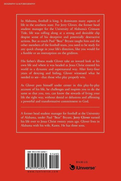 In Alabama, football is king. It dominates many aspects of life in the southern state. For Jerry Glover, the former head student manager for the University of Alabama's Crimson Tide, life was rolling along at a strong and desirable clip despite some of his deceptive and potentially destructive actions. But as coach Paul "Bear" Bryant taught him and the other members of the football team, you need to be ready for any quick change in your life's direction, like you would for a fumble or an interception on the gridiron. His father's illness made Glover take an inward look at his own life and where it was headed as Jesus Christ entered his world in a dynamic and supernatural way. After forty-four years of denying and hiding, Glover witnessed what he needed to see-that those who play properly win. As Glover puts himself under center in this play-by-play account of his life, he challenges and inspires you to do the same so that you, too, can know the rewards of living your life the right way, without denial or delusions and affirming a powerful and transformative commitment to God.