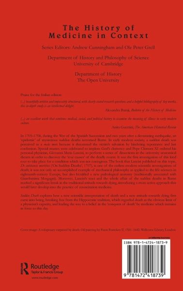 Introduction. Part I Sudden Death and the Physician's Role in Society: Fears; The medico-legal enquiry on sudden death, or: the truth of the body and the public role of physicians; From the dead to the living: medicine and public health in the early 18th century. Part II Sudden Death in Medical Theory and Practice: A new stance on death: the mechanical medicine of Lancisi's De subitaneis mortibus (1707); The pathological gaze: the problematic status of post-mortem evidence in early 18th-century medicine. Part III The Lost and the Saved: Sudden Death as an Ethical and Religious Issue: Death and the doctors: scientific queries and ethical dilemmas; In the hour of death; Looking for a heavenly protector: Saint Andrew Avellino, the 'apoplectic saint'. Epilogue: was there ever a sudden death 'epidemic' in Rome?; Index.