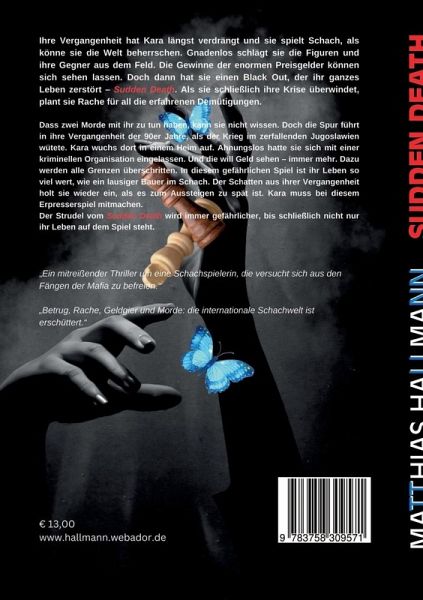Ihre Vergangenheit hat Kara längst verdrängt und sie spielt Schach, als könne sie die Welt beherrschen. Gnadenlos schlägt sie die Figuren und ihre Gegner aus dem Feld. Die Gewinne der enormen Preisgelder können sich sehen lassen. Doch dann hat sie einen Black Out, der ihr ganzes Leben zerstört: Sudden Death. Als sie schließlich ihre Krise überwindet, plant sie Rache für all die erfahrenen Demütigungen. Dass zwei Morde mit ihr zu tun haben, kann sie nicht wissen. Doch die Spur führt in ihre Vergangenheit der 90er Jahre, als der Krieg im zerfallenden Jugoslawien wütete. Kara wuchs dort in einem Heim auf. Ahnungslos hatte sie sich mit einer kriminellen Organisation eingelassen. Und die will Geld sehen, immer mehr. Dazu werden alle Grenzen überschritten. In diesem gefährlichen Spiel ist ihr Leben so viel wert, wie ein Bauer im Schach. Der Schatten aus ihrer Vergangenheit holt sie wieder ein, als es zum Aussteigen zu spät ist. Kara muss bei diesem Erpresserspiel mitmachen. Der Strudelvom Sudden Death wird immer gefährlicher, bis schließlich nicht nur ihr Leben auf dem Spiel steht."Ein mitreißender Thriller um eine Schachspielerin, die versucht sich aus den Fängen der Mafia zu befreien.Betrug, Rache, Geldgier und Morde: die internationale Schachwelt ist erschüttert."