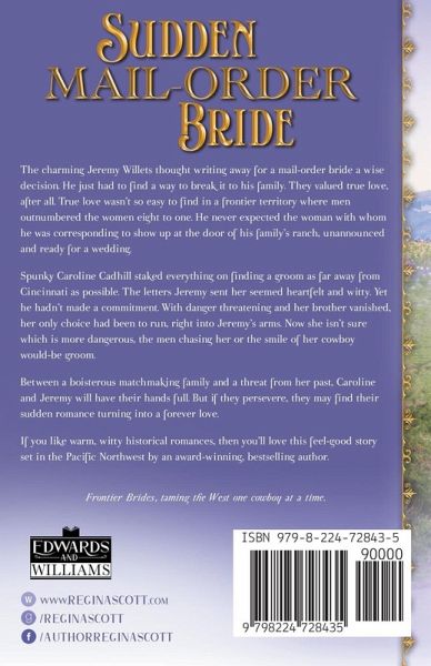 What's a fellow to do when his mail-order bride shows up all of a sudden? The charming Jeremy Willets thought writing away for a mail-order bride a wise decision. He just had to find a way to break it to his family. They valued true love, after all. True love wasn't so easy to find in a frontier territory where men outnumbered the women eight to one. He never expected the woman with whom he was corresponding to show up at the door of his family's ranch, unannounced and ready for a wedding. Spunky Caroline Cadhill staked everything on finding a groom as far away from Cincinnati as possible. The letters Jeremy sent her seemed heartfelt and witty. Yet he hadn't made a commitment. With danger threatening and her brother vanished, her only choice had been to run, right into Jeremy's arms. Now she isn't sure which is more dangerous, the men chasing her or the smile of her cowboy would-be groom. Between a boisterous matchmaking family and a threat from her past, Caroline and Jeremy will have their hands full. But if they persevere, they may find their sudden romance turning into a forever love. If you like warm, witty historical romances, then you'll love this feel-good story set in the Pacific Northwest by an award-winning, bestselling author. "Regina Scott writes some of today's best Historical Romance novels!" Huntress Reviews Frontier Brides, taming the West one cowboy at a time.