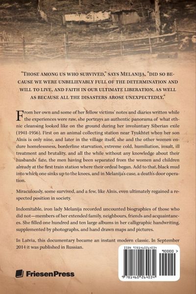 "Those among us who survived," says Melanija, "did so because we were unbelievably full of the determination and will to live, and faith in our ultimate liberation, as well as because all the disasters arose unexpectedly." From her own and some of her fellow victims' notes and diaries written while the experiences were raw, she portrays an authentic panorama of what ethnic cleansing looked like on the ground during her involuntary Siberian exile (1941-1956). First on an animal collecting station near Tyukhtet when her son Alnis is only nine, and later in the village itself, she and the other women endure homelessness, borderline starvation, extreme cold, humiliation, insult, ill treatment and brutality, and all the while without any knowledge about their husbands' fate, the men having been separated from the women and children already at the first train station where their ordeal began. Add to that, black mud into which one sinks up to the knees, and in Melanija's case, a death's door operation. Miraculously, some survived, and a few, like Alnis, even ultimately regained a respected position in society. Indomitable, iron lady Melanija recorded uncounted biographies of those who did not-members of her extended family, neighbours, friends and acquaintances. She filled one hundred and ten large albums in her calligraphic handwriting, supplemented by photographs, and hand drawn maps and pictures. In Latvia, this documentary became an instant modern classic. In September 2014 it was published in Russian.