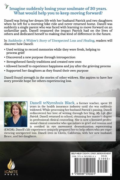 Imagine suddenly losing your soulmate of 30 years. What would help you to keep moving forward? Danell was living her dream life with her husband Patrick and two daughters when he left for a morning bike ride and never returned home. Danell was suddenly a single parent who was faced with learning to move forward on an unfamiliar path. Danell treasured the impact Patrick had on the lives of others and dedicated herself to making that kind of difference in the future. In Suddenly: A Widow's Story of Unexpected Loss and Healing, readers will discover how Danell:Used writing to record memories while they were fresh, helping to process grief Discovered a new purpose through introspection Strengthened family traditions and created new ones Allowed herself to experience happiness and joy after the grieving process Supported her daughters as they found their own purpose Danell found strength in the stories of other widows. She aspires to have her story provide hope for others experiencing loss.
