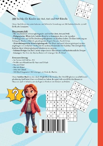 300 Sudoku für Kinder mit 4x4, 6x6 und 9x9 RätselnDieses Buch bietet eine unterhaltsame und lehrreiche Sammlung von 300 Sudoku-Rätseln, speziell für Kinder konzipiert. Was erwartet dich?- Mit verschiedenen Schwierigkeitsgraden und Größen (4x4, 6x6 und 9x9) - Pädagogischer Wert: Jedes Sudoku-Rätsel ist so konzipiert, dass es die logischen Denkfähigkeiten und die Problemlösungsfähigkeiten von Kindern fördert. Die klare Anleitung am Anfang des Buches erklärt die grundlegenden Regeln für jedes Puzzleformat.- Abwechslungsreiche Schwierigkeitsgrade: Die Rätsel sind nach Schwierigkeitsgrad sortiert, angefangen von einfachen 4x4-Puzzles bis zu herausfordernden 9x9-Sudokus. Dies ermöglicht es Kindern, ihren Schwierigkeitsgrad schrittweise zu steigern.- Schönes Design: Das Buch enthält ansprechende Illustrationen und kinderfreundliche Designs- Lösungen: Am Ende des Buches finden sich Lösungen für alle Rätsel Zusammenfassung:- Im Format A5- Perfekt zum Mitnehmen für Auto und Urlaub- 96x 4x4-Rätsel- 96x 6x6-Rätsel- 108x 9x9- Rätsel- 300 Rätsel insgesamt+ 300 Lösungen am Ende des BuchesDieses Sudoku-Buch ist eine ideale Möglichkeit für Kinder, ihre Denkfähigkeiten zu schärfen und gleichzeitig Spaß beim Lösen von Rätseln zu haben. Es eignet sich sowohl für den Einsatz zu Hause als auch in Schulen, um das logische Denken von Kindern zu fördern.