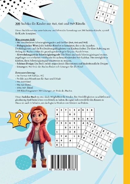 300 Sudoku für Kinder mit 4x4, 6x6 und 9x9 RätselnDieses Buch bietet eine unterhaltsame und lehrreiche Sammlung von 300 Sudoku-Rätseln, speziell für Kinder konzipiert. Was erwartet dich?- Mit verschiedenen Schwierigkeitsgraden und Größen (4x4, 6x6 und 9x9) - Pädagogischer Wert: Jedes Sudoku-Rätsel ist so konzipiert, dass es die logischen Denkfähigkeiten und die Problemlösungsfähigkeiten von Kindern fördert. Die klare Anleitung am Anfang des Buches erklärt die grundlegenden Regeln für jedes Puzzleformat.- Abwechslungsreiche Schwierigkeitsgrade: Die Rätsel sind nach Schwierigkeitsgrad sortiert, angefangen von einfachen 4x4-Puzzles bis zu herausfordernden 9x9-Sudokus. Dies ermöglicht es Kindern, ihren Schwierigkeitsgrad schrittweise zu steigern.- Schönes Design: Das Buch enthält ansprechende Illustrationen und kinderfreundliche Designs- Lösungen: Am Ende des Buches finden sich Lösungen für alle Rätsel Zusammenfassung:- Im Format A5- Perfekt zum Mitnehmen für Auto und Urlaub- 96x 4x4-Rätsel- 96x 6x6-Rätsel- 108x 9x9- Rätsel- 300 Rätsel insgesamt+ 300 Lösungen am Ende des BuchesDieses Sudoku-Buch ist eine ideale Möglichkeit für Kinder, ihre Denkfähigkeiten zu schärfen und gleichzeitig Spaß beim Lösen von Rätseln zu haben. Es eignet sich sowohl für den Einsatz zu Hause als auch in Schulen, um das logische Denken von Kindern zu fördern.
