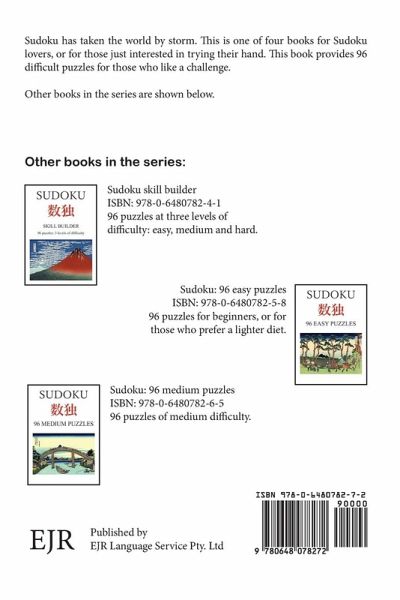A Sudoku puzzle book containing 96 diabolically difficult puzzles. The introduction includes brief instructions on how to play, and solutions to all puzzles are included at the end of the book. This is the final book (ISBN: 978-0-6480782-7-2) in a series of four. The other three books are 'Sudoku skill builder', which contains 96 puzzles at three levels of difficulty (book 1, ISBN: 978-0-6480782-4-1), 'Sudoku: 96 easy puzzles', containing 96 easy puzzles for busy people (book 2, ISBN: 978-0-6480782-5-8), and 'Sudoku: 96 medium puzzles', containing puzzles at a moderate level of difficulty (book 3, ISBN: 978-0-6480782-6-5).