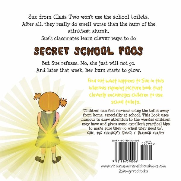Sue from Class Two won't use the SCHOOL TOILETS. After all, they really do smell worse than the bum of the stinkiest skunk. Sue's classmates learn clever ways to do SECRET SCHOOL POOS. But Sue refuses. No, she just will not go. And later that week, her BUM STARTS TO GLOW. Find out what happens to Sue in this hilarious rhyming picture book that cleverly encourages children to use school toilets.With a playful rhyming text and illustrations packed with humour, Sue From Class Two Has A Problem With Poo will make the whole family tinkle with laughter! The best book ever for children who:Love books about poo Dislike school toilets Have mild toilet or poo anxiety Are starting infant/junior/primary school Enjoy funny books that rhyme Need strategies to held them use school toilets and public washrooms And for fans of:Julia Donaldson picture books Dr Seuss books Poo in the Zoo Granny picture book series Funny rhyming books Toilet humour The perfect gift for kids age 3-8 who love to laugh and learn!