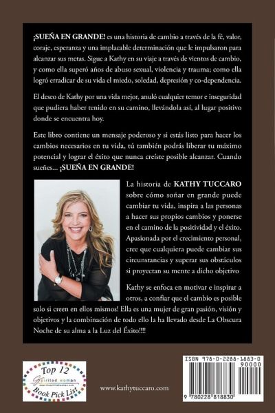 "Sueña en grande;" es una historia de cambio a través de la fé, valor, coraje, esperanza y una implacable determinación que le impulsaron para alcanzar sus metas. Sigue a Kathy en su viaje a través de vientos de cambio, y cómo ella superó años de abuso sexual, violencia y trauma; cómo ella logró erradicar de su vida el miedo, soledad, depresión y co-dependencia. El deseo de Kathy por una vida mejor, anuló cualquier temor e inseguridad que pudiera haber tenido en su camino, llevándola así, al lugar positivo donde se encuentra hoy. Este libro contiene un mensaje poderoso y si estás listo para hacer los cambios necesarios en tu vida, tú también podrás liberar tu máximo potencial y lograr el éxito que nunca creíste posible alcanzar. Cuando sueñes... ¡SUEÑA EN GRANDE!
