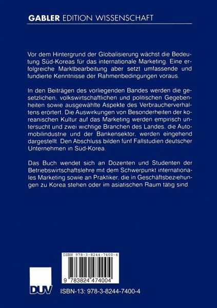 Vor dem Hintergrund der Globalisierung wächst die Bedeutung Süd-Koreas für das internationale Marketing. Eine erfolgreiche Marktbearbeitung aber setzt umfassende und fundierte Kenntnisse der Rahmenbedingungen voraus.