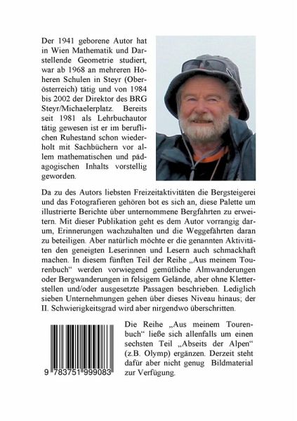 Da zu des Autors liebsten Freizeitaktivitäten die Bergsteigerei und das Fotografieren gehören bot es sich an, die Palette seiner Veröffentlichungen um illustrierte Berichte über unternommene Bergfahrten zu erweitern. Mit dieser Publikation geht es dem Autor vorrangig darum, Erinnerungen wachzuhalten und die Weggefährten daran zu beteiligen. Aber natürlich möchte er die genannten Aktivitäten den geneigten Leserinnen und Lesern auch schmackhaft machen. In diesem fünften Teil der Reihe "Aus meinem Tourenbuch" werden vorwiegend gemütliche Almwanderungen oder Bergwanderungen in felsigem Gelände, aber ohne Kletterstellen und/oder ausgesetzte Passagen beschrieben. Lediglich sieben Unternehmungen gehen über dieses Niveau hinaus; der II. Schwierigkeitsgrad wird aber nirgendwo überschritten.