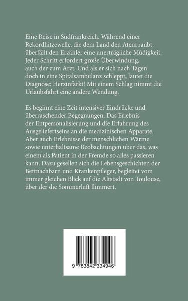 Eine Reise in Südfrankreich. Während einer Rekordhitzewelle, die dem Land den Atem raubt, überfällt den Erzähler eine unerträgliche Müdigkeit. Und als sich der Autor nach Tagen des Zögerns doch in eine Spitalsambulanz schleppt, lautet die Diagnose: Herzinfarkt! Mit einem Schlag nimmt die Urlaubsfahrt eine andere Wendung. Es beginnt eine innere Reise zwischen den Polen Verzagtheit und Hoffnung, zugleich beginnt eine Zeit intensiver Eindrücke und überraschender Begegnungen. Südfrankreich aus der Perspektive einer Herzstation: Das sind Erlebnisse der Entpersonalisierung und die Erfahrung des Ausgeliefertseins an die medizinischen Apparate, das sind aber auch Erlebnisse der menschlichen Wärme sowie unterhaltsame Beobachtungen über das, was einem als Patient in der Fremde so alles passieren kann. Das sind die Lebensgeschichten der Bettnachbarn und Krankenpfleger und das ist der immer gleiche Blick vom Spitalsbett auf die Altstadt von Toulouse, über der die Sommerluft flimmert.Eine Serie von Radierungen, mit der das Buch illustriert ist, läßt das kleine Buch auch zu einem Kunstgenuss werden.