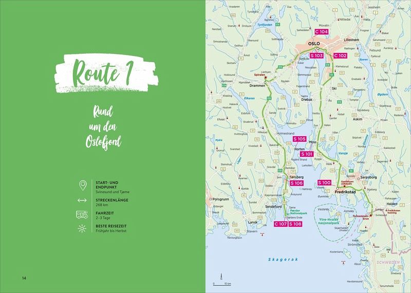 Die im Buch vorgeschlagenen zwölf Touren decken nahezu alle bekannten Sehenswürdigkeiten Südnorwegens ab und laden dazu ein, die schönsten Strecken nach eigenen Interessen zu kombinieren. Besonders reizvoll und für mich persönliche Highlights sind die ausführlich beschriebenen historischen Landschaftsrouten, insbesondere auf den Touren 6 bis 9. Die Touren sind insgesamt sehr gut durchdacht und sorgen dafür, dass man kein zentrales Highlight verpasst.