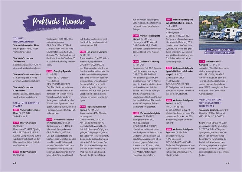 Im informativen Servicekapitel „Reiseinfos von A bis Z“ finden sich alle relevanten Informationen, beispielsweise zur Anreise, zu Fährverbindungen, zur Maut sowie zu Ver- und Entsorgungsmöglichkeiten. Weitere hilfreiche Extras wie Pack- und Checkliste, Register und ergänzende Hinweise am Buchende ergänzen das Angebot sinnvoll und sorgen dafür, dass man wirklich an alles denkt.