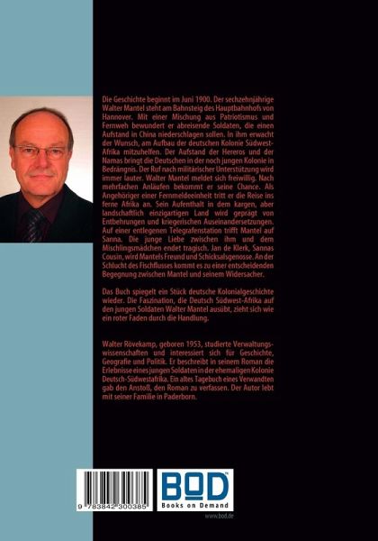 Südwestnach einem Tagebuch über Erlebnisse in Deutsch-Südwestafrika Anfang des zwanzigsten JahrhundertsDie Geschichte beginnt im Juni 1900. Der sechzehnjährige Walter Mantel steht am Bahnsteig des Hauptbahnhofs von Hannover. Mit einer Mischung aus Patriotismus und Fernweh bewundert er abreisende Soldaten, die einen Aufstand in China niederschlagen sollen. In ihm erwacht der Wunsch, am Aufbau der deutschen Kolonie Südwest-Afrika mitzuhelfen. Der Aufstand der Hereros und der Namas bringt die Deutschen in der noch jungen Kolonie in Bedrängnis. Der Ruf nach militärischer Unterstützung wird immer lauter. Walter Mantel meldet sich freiwillig. Nach mehrfachen Anläufen bekommt er seine Chance. Als Angehöriger einer Fernmeldeeinheit tritt er die Reise ins ferne Afrika an. Sein Aufenthalt in dem kargen, aber landschaftlich einzigartigen Land wird geprägt von Entbehrungen und kriegerischen Auseinandersetzungen. Auf einer entlegenen Telegrafenstation trifft Mantel auf Sanna. Die junge Liebe zwischen ihm und dem Mischlingsmädchen endet tragisch. Jan de Klerk, Sannas Cousin, wird Mantels Freund und Schicksalsgenosse. An der Schlucht des Fischflusses kommt es zu einer entscheidenden Begegnung zwischen Mantel und seinem Widersacher.