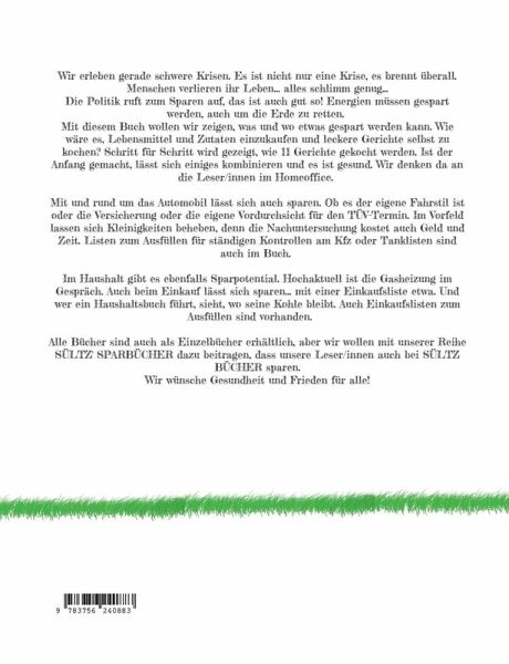 Wir erleben gerade schwere Krisen. Es ist nicht nur eine Krise, es brennt überall. Menschen verlieren ihr Leben... alles schlimm genug...Die Politik ruft zum Sparen auf, das ist auch gut so! Energien müssen gespart werden, auch um die Erde zu retten. Mit diesem Buch wollen wir zeigen, was und wo etwas gespart werden kann. Wie wäre es, Lebensmittel und Zutaten einzukaufen und leckere Gerichte selbst zu kochen? Schritt für Schritt wird gezeigt, wie 11 Gerichte gekocht werden. Ist der Anfang gemacht, lässt sich einiges kombinieren und es ist gesund. Wir denken da an die Leser/innen im Homeoffice. Mit und rund um das Automobil lässt sich auch sparen. Ob es der eigene Fahrstil ist oder die Versicherung oder die eigene Vordurchsicht für den TÜV-Termin. Im Vorfeld lassen sich Kleinigkeiten beheben, denn die Nachuntersuchung kostet auch Geld und Zeit. Listen zum Ausfüllen für ständigen Kontrollen am Kfz oder Tanklisten sind auch im Buch. Im Haushalt gibt es ebenfalls Sparpotential. Hochaktuell ist die Gasheizung im Gespräch. Auch beim Einkauf lässt sich sparen... mit einer Einkaufsliste etwa. Und wer ein Haushaltsbuch führt, sieht, wo seine Kohle bleibt. Auch Einkaufslisten zum Ausfüllen sind vorhanden. Alle Bücher sind auch als Einzelbücher erhältlich, aber wir wollen mit unserer Reihe SÜLTZ' SPARBÜCHER dazu beitragen, dass unsere Leser/innen auch bei SÜLTZ BÜCHER sparen.Wir wünsche Gesundheit und Frieden für alle!