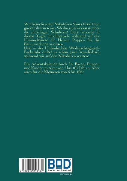 Wir besuchen den Nikobären Santa Petz! Und gucken ihm in seiner Weihnachtswerkstatt über die plüschigen Schultern! Dort herrscht in diesen Tagen Hochbetrieb, während auf der Himmelswiese die kleinen Puppen für die Bärenmädchen wachsen.Und in der Himmlischen Weihnachtsgutsel-Backstube duftet es schon ganz "wunderbär", während wir auf den Nikobären warten!Ein Adventskalenderbuch für Bären, Puppen und Kinder im Alter von 7 bis 107 Jahren. Aber auch für die Kleineren von 6 bis 106!