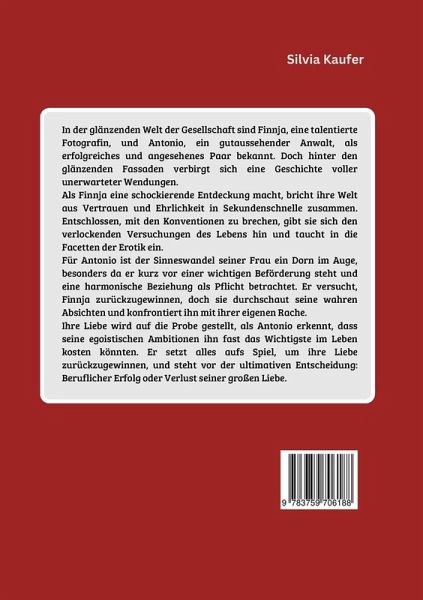 Tauche ein in eine Welt voller Leidenschaft und Intrigen, in "Süße Rache - prickelnd und scharf". Finnja, die talentierte Fotografin, und der charmante Anwalt Antonio verkörpern das Bild eines erfolgreichen Power-Paares in der Gesellschaft. Doch hinter der Fassade aus Erfolg und Ansehen verbirgt sich ein düsteres Geheimnis, das nur Finnjas Freundin Lulu zu erahnen scheint.Als Finnja eines Tages eine schockierende Entdeckung macht, zerbricht ihr scheinbar perfektes Weltbild in Sekundenschnelle. Fest entschlossen, sich nicht länger von den Fesseln der Ehe und den Zwängen der Gesellschaft einschränken zu lassen, beschließt sie, fortan alle Verlockungen der Lust zu genießen - ohne Hemmungen und ohne Rücksicht auf Konventionen. Doch ihr Sinneswandel stößt bei Antonio auf Ablehnung. Vor allem jetzt, da er kurz vor einer wichtigen Beförderung steht, kann er sich keine Probleme in seiner Beziehung leisten.Mit geschickten Intrigen versucht Antonio, Finnja zurückzugewinnen, doch sie durchschaut seine Pläne und dreht den Spieß um. Ihre süße Rache entfacht eine unerwartete Leidenschaft, die Antonio zeigt, wie sehr er seine Frau wirklich liebt. Doch um sie zurückzugewinnen, muss er seinen bisherigen Lebensweg hinterfragen und sich ehrlich seinen Gefühlen stellen.In "Süße Rache - prickelnd und scharf" entfaltet sich eine Geschichte voller Sinnlichkeit und Verführung, in der die Grenzen zwischen Lust und Liebe verschwimmen. Wird Antonio es gelingen, Finnja zurückzugewinnen, bevor es zu spät ist? Finde es heraus in diesem heißen Roman, der deine Fantasie beflügelt und dein Herz zum Rasen bringt.Nur zur Info: Die Geschichte steckt voller Herzlichkeit und natürlich gibt es auch einige leidenschaftliche, äußerst erotische Szenen. Diese Szenen werden ausführlich beschrieben und verwenden eine lockere Sprache, die gelegentlich auch etwas anzüglich sein kann. Es gibt keine Gewalt oder vulgäre Ausdrücke. Die reine Erotik soll dazu dienen, die Fantasie zu beflügeln.