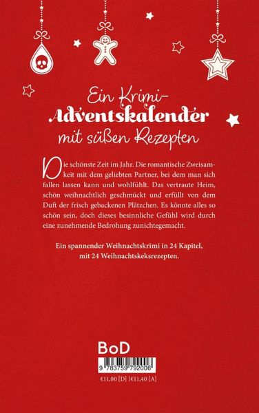 Die schönste Zeit im Jahr. Die romantische Zweisamkeit mit dem geliebten Partner, bei dem man sich fallen lassen kann und wohlfühlt. Das vertraute Heim, schön weihnachtlich geschmückt und erfüllt von dem Duft der frisch gebackenen Plätzchen. Es könnte alles so schön sein, doch dieses besinnliche Gefühl wird durch eine zunehmende Bedrohung zunichtegemacht. Ein spannender Weihnachtskrimi in 24 Kapitel, mit 24 Weihnachtskeksrezepten.
