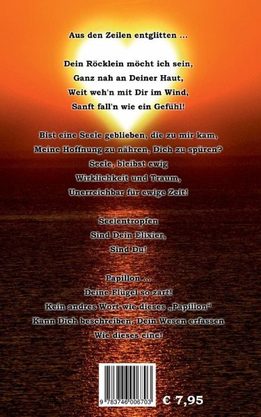 Aus den Zeilen entwichen ...Dein Röcklein möcht ich sein,Ganz nah an Deiner Haut,Weit weh'n mit Dir im Wind,Sanft fall'n wie ein Gefühl!Bist eine Seele geblieben, die zu mir kam,Meine Hoffnung zu nähren, Dich zu spüren?Seele, bleibst ewigWirklichkeit und Traum,Unerreichbar für ewige Zeit!SeelentropfenSind Dein Elixier,Sind Du!PapillonDeine Flügel so zart!Kein andres Wort wie dieses PapillonKann Dich beschreiben, Dein Wesen erfassenWie dieses eine!