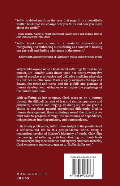 Why would anyone write a book about suffering? Earnest in her pursuit, Dr. Jennifer Clark draws upon her near 25 years of practice as a Hospice and Palliative Medicine physician to convince us otherwise. Clark adeptly navigates the ups and downs, the twists and turns, and the pitfalls and plateaus of human development, asking us to reimagine the pilgrimage of the human condition. With suffering as her compass, Clark takes us on a journey through the difficult terrains of fear and shame, ignorance and judgement, isolation and longing. In doing so, we are given a choice to see these painful experiences differently. Vital to human development, these sufferings reveal the direction we must take to progress through the milestones of dependence, independence, interdependence and transcendence. In its timely publication, Suffer. offers insight to the possibility of a self-actualized life in this post-pandemic world. Using a modernized version of Maslow's hierarchy of needs, Clark flips the paradigm of suffering on its head. Guiding us through lands where storytelling meets science and mystery embraces material, Clark empowers and encourage us to "Suffer. Suffer, well."