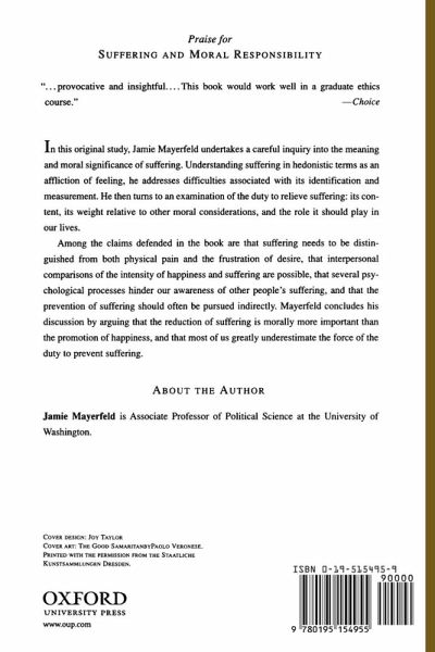 In this original study, Jamie Mayerfeld undertakes a careful inquiry into the meaning and moral significance of suffering. Understanding suffering in hedonistic terms as an affliction of feeling, he addresses difficulties associated with its identification and measurement. He then turns to an examination of the duty to relieve suffering: its content, its weight relative to other moral considerations, and the role it should play in our lives. Among the claims defended in the book are that suffering needs to be distinguished from both physical pain and the frustration of desire, that interpersonal comparisons of the intensity of happiness and suffering are possible, that several psychological processes hinder our awareness of other people's suffering, and that the prevention of suffering should often be pursued indirectly. Mayerfeld concludes his discussion by arguing that the reduction of suffering is morally more important than the promotion of happiness, and that most of us greatly underestimate the force of the duty to prevent suffering. As the first systematic book-length inquiry into the moral significance of suffering, Suffering and Moral Responsibility makes an important contribution to moral philosophy and political theory, and will interest specialists in each of these areas.