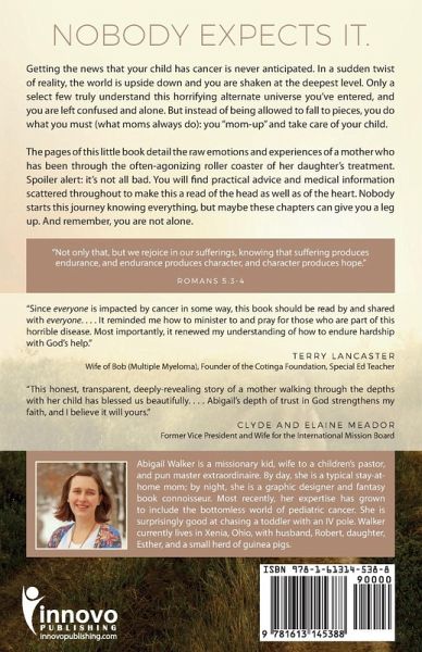 NOBODY EXPECTS IT Getting the news that your child has cancer is never anticipated. In a sudden twist of reality, the world is upside down and you are shaken at the deepest level. Only a select few truly understand this horrifying alternate universe you've entered, and you are left confused and alone. But instead of being allowed to fall to pieces, you do what you must (what moms always do): you "mom-up" and take care of your child. The pages of this little book detail the raw emotions and experiences of a mother who has been through the often-agonizing roller coaster of her daughter's treatment. Spoiler alert: it's not all bad. You will find practical advice and medical information scattered throughout to make this a read of the head as well as of the heart. Nobody starts this journey knowing everything, but maybe these chapters can give you a leg up. And remember, you are not alone. "Not only that, but we rejoice in our sufferings, knowing that suffering produces endurance, and endurance produces character, and character produces hope." -Romans 5:3-4 -- --AUTHOR BIO:Abigail Walker is a missionary kid, wife to a children's pastor, and pun master extraordinaire. By day, she is a typical stay-at-home mom; by night, she is a graphic designer and fantasy book connoisseur. Most recently, her expertise has grown to include the bottomless world of pediatric cancer. She is surprisingly good at chasing a toddler with an IV pole. Walker currently lives in Xenia, Ohio, with husband, Robert, daughter, Esther, and a small herd of guinea pigs. --ABOUT INNOVO PUBLISHING: Innovo is a conservative Christian publisher, providing full-service publishing services for Christian authors, artists and ministries through: - Traditional Royalty Publishing where Innovo acquires publishing rights and pays the author an advance and royalties, - Cooperative Publishing where Innovo and the client jointly invest and share royalties proportionately, and - Independent publishing where the client pays for Innovo's professional publishing services. Innovo publishes hardbacks, paperbacks, ebooks, audiobooks, music, screenplays, film, and courses and provides full-service editorial, design, publishing, distribution, marketing, and support globally. Every Innovo title aligns with biblical principles and meets the publishing industry's highest editorial, theological, and design standards.