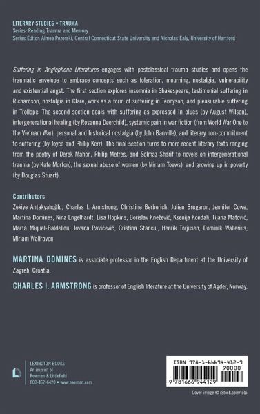 Suffering in Anglophone Literatures engages with postclassical Trauma Studies and opens the traumatic envelope to embrace concepts such as toleration, mourning, nostalgia, vulnerability and existential Angst. The first section explores insomnia in Shakespeare, testimonial suffering in Richardson, nostalgia in Clare, work as a form of suffering in Tennyson and pleasurable suffering in Trollope. The second section deals with suffering as expressed in blues (by August Wilson), intergenerational healing (by Rosanna Deerchild), systemic pain in war fiction (from World War One to the Vietnam War), personal and historical nostalgia (by John Banville) and literary non-commitment to suffering (by Joyce, and Philip Kerr). The final section turns to more recent literary texts ranging from the poetry of Derek Mahon, Philip Metres and Solmaz Sharif to novels on intergenerational trauma (by Kate Morton), the sexual abuse of women (by Miriam Toews) and growing up in poverty (by Douglas Stuart).