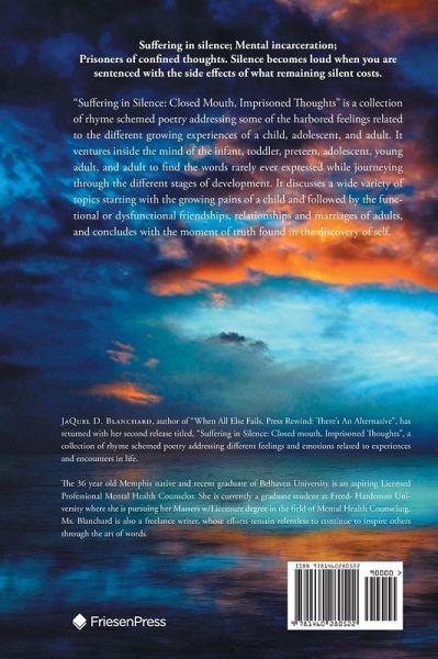 Suffering in Silence: Closed Mouth, Imprisoned Thoughts is a collection of rhyme schemed poetry addressing some of the harbored feelings related to the different growing experiences of a child, adolescent, and adult. It ventures inside the mind of the infant, toddler, preteen, adolescent, young adult, and adult to find the words rarely ever expressed while journeying through the different stages of development. It discusses a wide variety of topics starting with the growing pains of a child and followed by the functional or dysfunctional friendships, relationships and marriages of adults, and concludes with the moment of truth found in the discovery of self.