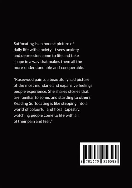 Suffocating is an honest picture of daily life with anxiety. It sees anxiety and depression come to life and take shape in a way that makes them all the more understandable and conquerable. "Rosewood paints a beautifully sad picture of the most mundane and expansive feelings people experience. She shares stories that are familiar to some, and startling to others. Reading Suffocating is like stepping into a world of colourful and floral tapestry, watching people come to life with all of their pain and fear."