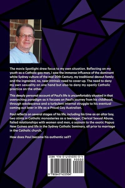 The movie Spotlight drew focus to my own situation. Reflecting on my youth as a gay Catholic male, I saw the immense influence of the dominant white Sydney culture of the mid-20th Century, my traditional devout family and the ingrained, no, near intrinsic need to cover-up. The need to deny my own sexuality on one hand but also to deny my openly Catholic practice on the other. This deeply personal account of Paul's life is uncomfortably situated in that overarching paradigm as it focuses of Paul's journey from his childhood, through adolescence and a turbulent internal struggle to his eventual coming out later in life as a Proud Gay Australian. Paul reflects on several stages of his life including: his time as an altar boy, two stints in Catholic monasteries as a teenager, Clerical Sexual Abuse, failed relationships with women and men, a sojourn to the exotic Papua New Guinea and life in the Sydney Catholic Seminary, all prior to marriage in the Catholic church. How does Paul become his authentic self?