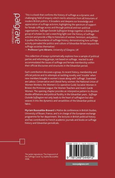 'This is a book that confirms the history of suffrage as a dynamic and challenging field of enquiry which merits attention from all historians of modern British politics. It broadens and deepens our knowledge and appreciation of suffrage activism, highlighting the spectrum of support for female suffrage across and through political and non-political organisations. Suffrage Outside Suffragism brings together a distinguished group of scholars to cast a searching light over the history of suffrage activism and provide a fillip to historians of women, feminism, and politics. It pushes the boundaries of suffrage history, demonstrating how suffrage activity pervaded the politics and culture of Edwardian Britain beyond the suffrage societies themselves' - Professor Lynn Abrams, University of Glasgow