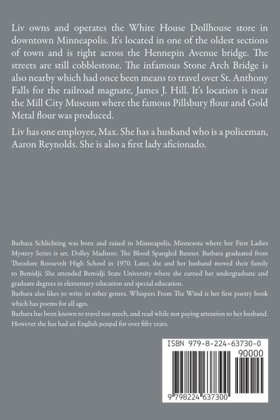 Liv owns and operates the White House Dollhouse store in downtown Minneapolis. It's located in one of the oldest sections of town and is right across the Hennepin Avenue bridge. The streets are still cobblestone. The infamous Stone Arch Bridge is also nearby which had once been means to travel over St. Anthony Falls for the railroad magnate, James J. Hill. It's location is near the Mill City Museum where the famous Pillsbury flour and Gold Metal flour was produced. Liv has one employee, Max. She has a husband who is a policeman, Aaron Reynolds. She is also a first lady aficionado.