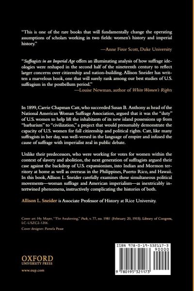 In 1899, Carrie Chapman Catt, who succeeded Susan B. Anthony as head of the National American Women Suffrage Association, argued that it was the "duty" of U.S. women to help lift the inhabitants of its new island possessions up from "barbarism" to "civilization," a project that would presumably demonstrate the capacity of U.S. women for full citizenship and political rights. Catt, like many suffragists in her day, was well-versed in the language of empire, and infused the cause of suffrage with imperialist zeal in public debate. Unlike their predecessors, who were working for votes for women within the context of slavery and abolition, the next generation of suffragists argued their case against the backdrop of the U.S. expansionism into Indian and Mormon territory at home as well as overseas in the Philippines, Puerto Rico, and Hawaii. In this book, Allison L. Sneider carefully examines these simultaneous political movements--woman suffrage and American imperialism--as inextricably intertwined phenomena, instructively complicating the histories of both.