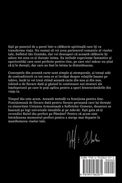 Cum ar fi dac¿ ar exista o persoan¿ care a fost creat¿ doar pentru tine, ¿i numai pentru tine? Dac¿ ar exista cineva care ar putea s¿-¿i satisfac¿ TOATE nevoile, poftele ¿i dorin¿ele ca Partenerul t¿u Perfect? Ai numi aceast¿ persoan¿ "Cel ales"? Noi îi numim Sufletul t¿u Geam¿n, iar aceast¿ carte î¿i va ar¿ta cum s¿ g¿se¿ti, s¿ identifici ¿i s¿ p¿strezi aceast¿ persoan¿ în viäa ta, pentru toat¿ viäa. Sufletul t¿u Geam¿n a fost conceput pentru tine ca Iubitul t¿u Des¿vâr¿it, care este destinat s¿ petreac¿ viä¿ dup¿ viä¿ al¿turi de tine într-o dragoste profund¿, pasional¿ ¿i etern¿. Ei sunt partenerul t¿u perfect în viä¿ ca iubit, partener, prieten, aliat ¿i tot ceea ce î¿i dore¿ti. Îi cuno¿ti dup¿ sentimentul pe care îl ai pentru acea persoan¿ special¿ din inima ta ¿i care ¿tii c¿ se afl¿ acolo. Este timpul s¿ î¿i aduci Sufletul Geam¿n de "acolo," în viäa ta. Aceast¿ carte este conceput¿ pentru a-¿i ar¿ta cum ¿i ce trebuie s¿ faci atunci când e¿ti unit cu Sufletul t¿u Geam¿n.
