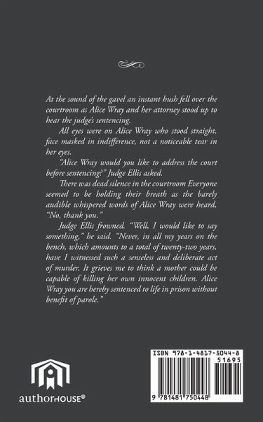 At the sound of the gavel an instant hush fell over the courtroom as Alice Wray and her attorney stood up to hear the judge's sentencing. All eyes were on Alice Wray who stood straight, face masked in indifference, not a noticeable tear in her eyes. "Alice Wray would you like to address the court before sentencing?" Judge Ellis asked. There was dead silence in the courtroom Everyone seemed to be holding their breath as the barely audible whispered words of Alice Wray were heard, "No, thank you." Judge Ellis frowned. "Well, I would like to say something," he said. "Never, in all my years on the bench, which amounts to a total of twenty-two years, have I witnessed such a senseless and deliberate act of murder. . It grieves me to think a mother could be capable of killing her own innocent children. Alice Wray you are hereby sentenced to life in prison without benefit of parole."