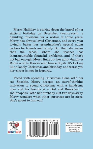 Merry Halliday is staring down the barrel of her sixtieth birthday on December twenty-sixth, a daunting milestone for a widow of three years. Merry has always loved Christmas, and every year lovingly bakes her grandmother's special sugar cookies for friends and family. But then she learns that the school where she teaches has insurmountable financial problems, and if that's not bad enough, Merry finds out her adult daughter Robin is off to Hawaii with fiancé Elijah. It's looking like a lonely Christmas and birthday, and worse yet, her career is now in jeopardy. Faced with spending Christmas alone with her cat Spookie, Merry accepts an out-of-the-blue invitation to spend Christmas with a handsome man and his friends at a Bed and Breakfast in Indianapolis. With her birthday just two days away, Merry wonders what other surprises are in store. She's about to find out!