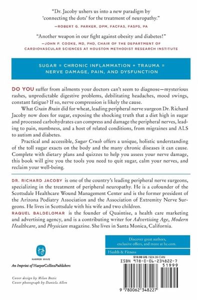 A shocking look at the link between sugar, inflammation, and a host of preventable chronic diseases?perfect for fans of bestselling author Gary Taubes' The Case Against Sugar?from leading nerve surgeon Dr. Richard Jacoby. What Grain Brain did for wheat, this book by a leading peripheral nerve surgeon now does for sugar, revealing how it causes crippling nerve damage throughout the body?in our feet, organs, and brain?why sugar and carbohydrates are harmful to the body's nerves, and how eliminating them can mitigate and even reverse the damage. If you suffer from ailments your doctors can't seem to diagnose or help?mysterious rashes, unpredictable digestive problems, debilitating headaches, mood and energy swings, constant tiredness?nerve compression is the likely cause. Sugar Crush exposes the shocking truth about how a diet high in sugar, processed carbohydrates, and wheat compresses and damages the peripheral nerves of the body, leading to pain, numbness, and tingling in the hands and feet, along with a host of related conditions, including migraines, gall bladder disease, and diabetes. Over the years, Dr. Richard Jacoby has treated thousands of patients with peripheral neuropathy. Now, he shares his insights as well as the story of how he connected the dots to determine how sugar is the common denominator of many chronic diseases. In Sugar Crush, he offers a unique holistic approach to understanding the exacting toll sugar and carbs take on the body. Based on his clinical work, he breaks down his highly effective methods, showing how dietary changes reducing sugar and wheat, coinciding with an increase of good fats, can dramatically help regenerate nerves and rehabilitate their normal function. Sugar Crush includes a quiz to assess your nerve damage, practical dietary advice, and the latest thinking on ways to prevent and reverse neuropathy. If you have diabetes, this essential guide will help you understand the dangers and give you the tools you need to make a difference beyond your doctor's prescriptions. If you have the metabolic syndrome or prediabetes, or are just concerned about your health, it will help you reverse and prevent nerve damage.