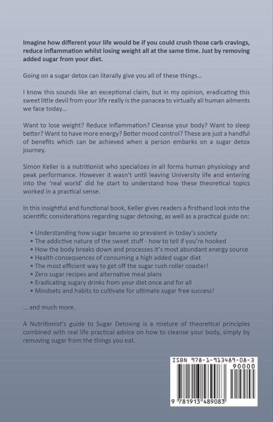Imagine how different your life would be if you could crush those carb cravings, reduce inflammation whilst losing weight all at the same time. Just by removing added sugar from your diet. Going on a sugar detox can literally give you all of these things… I know this sounds like an exceptional claim, but in my opinion, eradicating this sweet little devil from your life really is the panacea to virtually all human ailments we face today… Want to lose weight? Reduce inflammation? Cleanse your body? Want to sleep better? Want to have more energy? Better mood control? These are just a handful of benefits that can be achieved when a person embarks on a sugar detox journey. Simon Keller is a nutritionist who specializes in all forms of human physiology and peak performance. However, it wasn't until leaving University life and entering into the 'real world' did he start to understand how these theoretical topics worked in a practical sense. In this insightful and functional book, Keller gives readers a firsthand look into the scientific considerations regarding sugar detoxing, as well as a practical guide on: Understanding how sugar became so prevalent in today's society The addictive nature of the sweet stuff - how to tell if you're hooked How the body breaks down & processes it's most abundant energy source Health consequences of consuming a high added sugar diet The most efficient way to get off the sugar rush roller coaster! Zero sugar recipes and alternative meal plans Eradicating sugary drinks from your diet once and for all Mindsets and habits to cultivate for ultimate sugar-free success! … and much more. A Nutritionist's Guide to Sugar Detoxing is a mixture of theoretical principles combined with real-life practical advice on how to cleanse your body, simply by removing sugar from the things you eat.