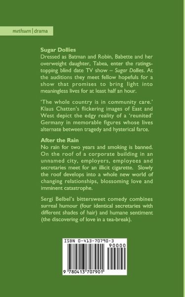 A new German and Catalan play together in one volume Sugar Dollies by Klaus Chatten (Germany) Dressed as Batman and Robin, Babette and her overweight daughter, Tabea enter the ratings-topping blind date TV show - Sugar Dollies. At the auditions they meet fellow hopefuls for a show that promises to bring light into meaningless lives for at least half an hour. After the Rain by Sergei Belbel (Spain) No rain for two years and smoking is banned. On the roof of a corporate building in an unnamed city, employers, employees and secretaries meet for an illicit cigarette. Slowly the roof top scene develops into a whole new world of changing relationshps, blossoming love and imminent catastrophe. "The whole country is in community care" Klaus Chatten's flickering images of East and West depict the edgy reality of a reunited Germany in memorable figures whose lives alternate between tragedy and hysterical farce. Sergi Belbel's bittersweet comedy combines surreal humour (four secretaries identical, except for their different shades of hair) and human sentiment (the discovery of love in a tea-break).