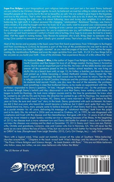 Sugar-Free Religion is part biographical, part religious instruction and part just a fun read. Denny believed we are called to be Christian change agents. As such, he believed we must be willing to relate not only to the beautiful people of this world, but to the not so beautiful, as well. We are called to give hope to the hopeless, and love to the unlovely. That is what Jesus did, and that is what he calls us to do. In short, the whole Gospel is not about following the right rules. It is about following Jesus and loving your neighbor. It is not about believing the right stuff; it is about personal life-changing "relationships." Relational Theology was Denny's entire ministry. It is what he taught and how he lived. So if you really want to expand your consciousness and find your true authentic self, then why not try looking at every person you meet as a special gift from God? Every stranger is a wonderful opportunity for you to experience new joy, self-fulfillment and self-discovery. So reach out and touch someone! Comfort a friend who is hurting. Give hugs to everyone. Be kind to a lonely child. Visit the aged in nursing homes. Take flowers to someone who is sick. Bring cheer to someone who is dying. Give comfort to someone in grief. Gladly give yourself away. That is how you find your life, by losing it! Most of the stories and examples in the book come from first-hand experience. From Wilmington to Burlington and from Laurinburg to Oxford, he became a part of the lives of the parishioners he was sent to serve. So get ready to have your heart "strangely warmed" as you read the pages of his book. He will knock the sugar coating, the marshmallow fluffiness and even the sugar sprinkles from your faith. Open your heart and your mind for a new experience. Don't worry if a few things fall to the wayside. That's OK, because from there you can begin to build your own bright, shiny faith---free of the stickiness. Experience now the joy of living a life without the "ick." ---Judy Wise