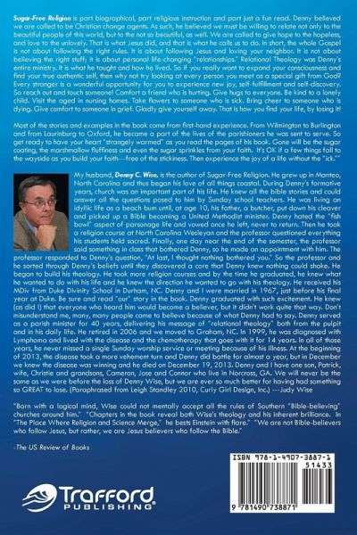 Sugar-Free Religion is part biographical, part religious instruction and part just a fun read. Denny believed we are called to be Christian change agents. As such, he believed we must be willing to relate not only to the beautiful people of this world, but to the not so beautiful, as well. We are called to give hope to the hopeless, and love to the unlovely. That is what Jesus did, and that is what he calls us to do. In short, the whole Gospel is not about following the right rules. It is about following Jesus and loving your neighbor. It is not about believing the right stuff; it is about personal life-changing "relationships." Relational Theology was Denny's entire ministry. It is what he taught and how he lived. So if you really want to expand your consciousness and find your true authentic self, then why not try looking at every person you meet as a special gift from God? Every stranger is a wonderful opportunity for you to experience new joy, self-fulfillment and self-discovery. So reach out and touch someone! Comfort a friend who is hurting. Give hugs to everyone. Be kind to a lonely child. Visit the aged in nursing homes. Take flowers to someone who is sick. Bring cheer to someone who is dying. Give comfort to someone in grief. Gladly give yourself away. That is how you find your life, by losing it! Most of the stories and examples in the book come from first-hand experience. From Wilmington to Burlington and from Laurinburg to Oxford, he became a part of the lives of the parishioners he was sent to serve. So get ready to have your heart "strangely warmed" as you read the pages of his book. He will knock the sugar coating, the marshmallow fluffiness and even the sugar sprinkles from your faith. Open your heart and your mind for a new experience. Don't worry if a few things fall to the wayside. That's OK, because from there you can begin to build your own bright, shiny faith---free of the stickiness. Experience now the joy of living a life without the "ick." ---Judy Wise