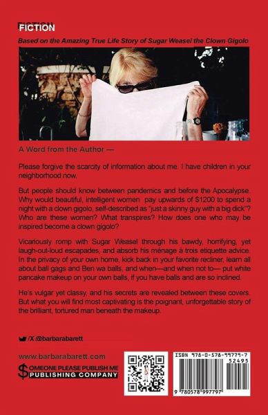 People should know. Between pandemics and before the Apocalypse, people should find out. Why would beautiful, intelligent women pay upwards of $1,200 to spend a night with the cover-illustrated clown gigolo, self-described as "just a skinny guy with a big dick"? Who are these women? Are they amongst you? Or are you one of them? What transpires? How does one become a clown gigolo should you or a loved one decide to choose that path? Vicariously romp with Sugar Weasel through his bawdy, horrifying, yet laugh-out-loud escapades, and absorb his ménage à trois etiquette advice. In the privacy of your own home kick back in your favorite recliner, learn all about ball gags and Ben wa balls, and when-and when not to-wear white pancake makeup on your personal balls, if you have balls and should become so inclined. He's vulgar yet classy, and his secrets are revealed between these covers. But what you will find most captivating is the poignant, unforgettable story of the brilliant, tortured man beneath the makeup. Twitter @ BarbaraBarett www.BarbaraBarett.com