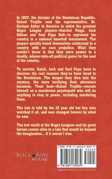 In 1937, the dictator of the Dominican Republic, Rafael Trujillo sent his representative, Dr. Enrique Aybar to America to enlist the greatest Negro League players-Satchel Paige, Josh Gibson and Cool Papa Bell-to represent his country in a national baseball tournament. The players quickly found themselves celebrated in a country with no race prejudice. What they couldn't know is that they were pawns in a deadly, winner-take-all political game for the soul of the country. To survive, Satch, Josh and Cool Papa have to discover the real reasons they've been lured to the Dominican. The deeper they dive into the mystery, the more terrifying their adventure becomes. Their host-Rafael Trujillo-reveals himself as a murderous psychopath who will do anything to stay in power, including murdering them. The tale is told by the 12 year old bat boy who watched it all, and was changed forever by what he saw. The lost world of the Negro Leagues and its great heroes comes alive in a tale that would be beyond the imagination... if it weren't true.