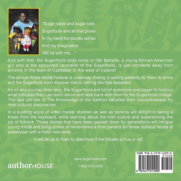 "Sugar roads and sugar toes Sugarfoots and all that glows In my hand the stones will be And my imagination Will be with me..." And with that, the Sugarfoots dolls come to life! Babelle, a young African-American girl who is the appointed caretaker of the Sugarfoots, is just moments away from arriving in the town of Castlebar in the west of Ireland! The annual Roola Boola Festival is underway. Aisling is waiting patiently for them to arrive and the Sugarfoots soon discover she is nothing like they expected. As on any journey they take, the Sugarfoots are full of questions and eager to find out what folktales they can learn about and take back with them to the Sugarfoots village. The age old tale of The Knowledge of the Salmon satisfies their inquisitiveness for new cultural discoveries. In a bustling world of video mania, children as well as parents will delight in taking a break from the keyboard, while learning about the Irish culture and experiencing the joy of folklore. These stories that have been passed down for generations will intrigue young minds and bring smiles of remembrance from parents for these dubious fables of yesteryear with a fresh new twist. It will be up to them to determine if the folktale is true or not...