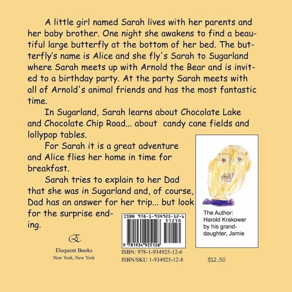 A little girl named Sarah lives with her parents and her baby brother. One night she awakens to find a beautiful large butterfly at the bottom of her bed. The butterfly's name is Alice and she flies Sarah to Sugarland, where Sarah meets up with Arnold the Bear and is invited to a birthday party. At the party Sarah meets with all of Arnold's animal friends and has the most fantastic time. In Sugarland, Sarah learns about Chocolate Lake and Chocolate Chip Road . . . about candy cane fields and lollypop tables.For Sarah it is a great adventure, and Alice flies her home in time for breakfast. Sarah tries to explain to her dad that she was in Sugarland and, of course, Dad has an answer for her trip . . . but look for the surprise ending.